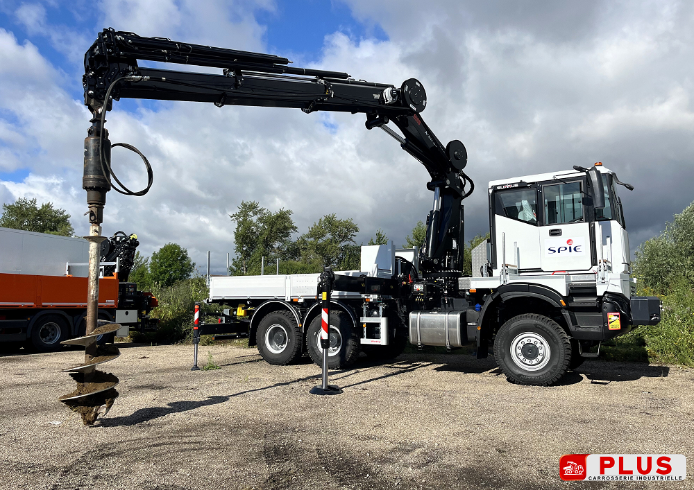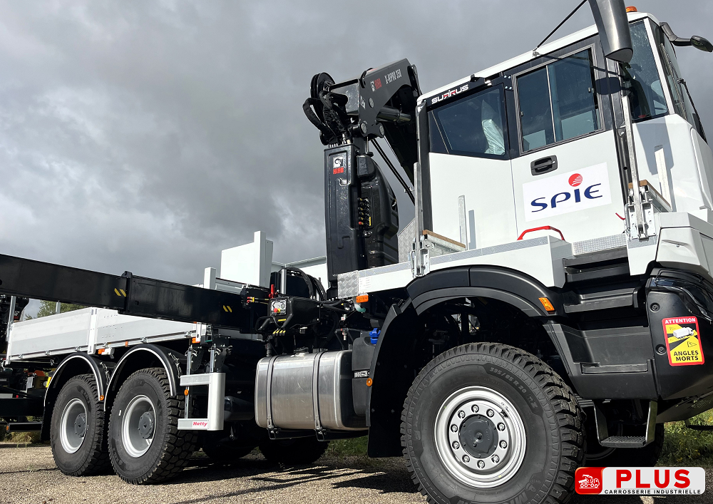 Ci-dessus un véhicule IVECO AD 260 T36 W avec cabine centrale, équipé d’une grue HIAB X358 E6 HIPRO destiné aux services multi techniques dans les domaines de l’énergie et du bâtiment.